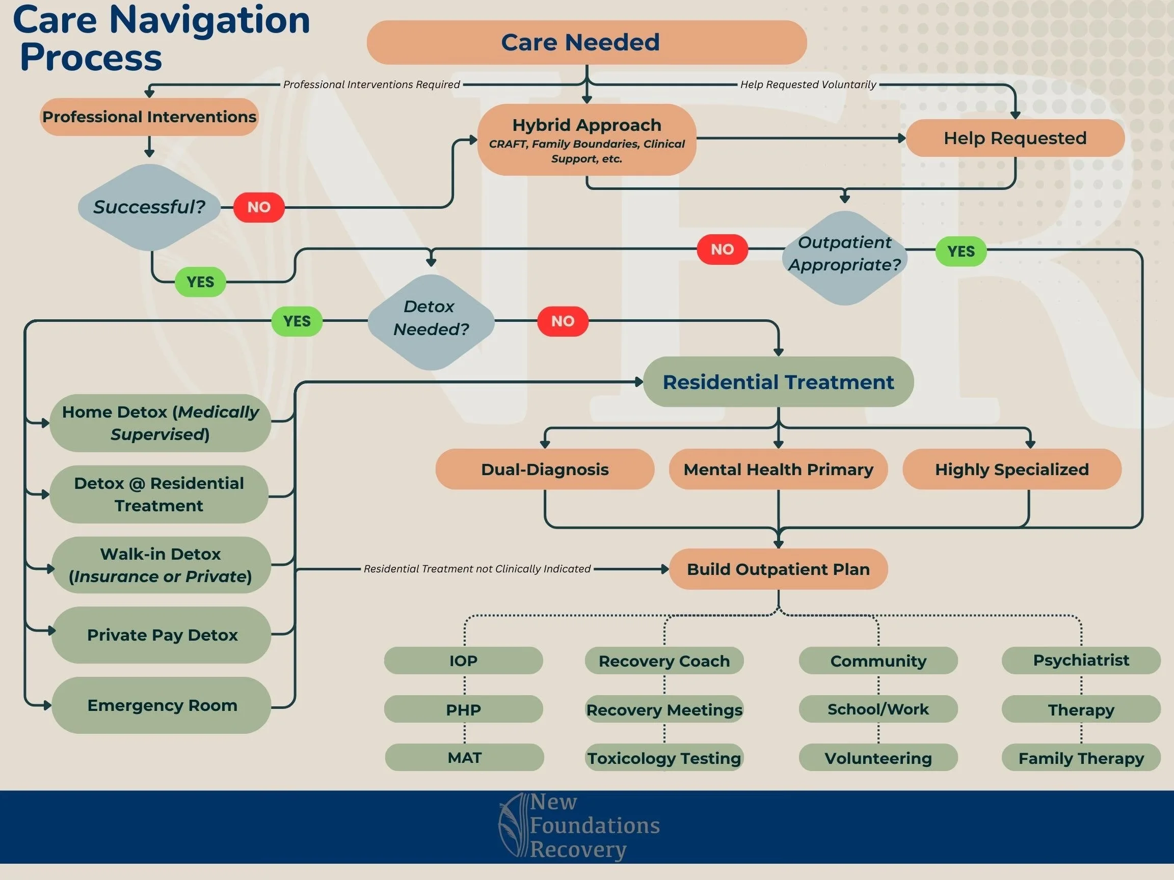 Care Navigation at New Foundations Recovery supports families during this critical decision-making period. We work collaboratively to identify treatment options that align with an individual’s needs, personal circumstances, and long-term goals. Our role is to help families move forward with clarity and intention rather than urgency and guesswork.
